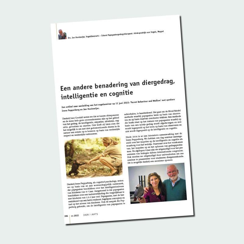 In de november editie van Dier EN ARTS werd een artikel geplaatst n.a.v. het vogelseminar op 11 juni 2022: ‘Parrot Behaviour and Welfare’ met sprekers Irene Pepperberg en Jan Hooimeijer.